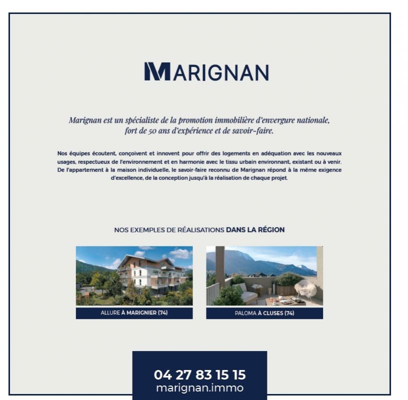 NOUVEAU à MARNAZ ! Soyez parmi les premiers à choisir votre appartement neuf avec espace extérieur et parking ! Située dans un environnement paisible et verdoyant, notre nouvelle résidence propose seulement 35 logements un étage, garantissant une atmosphère intimiste et sereine pour tous ses résidents. Du 2 au 4 pièces, chaque appartement est prolongé d’un espace extérieur — balcon ou jardin privatif — véritable pièce à vivre supplémentaire pour profiter des beaux jours et de vues sur les montagnes environnantes. Plusieurs places de stationnement en sous-sol pour chaque appartement, une cave pour chaque résident et le local vélos apportent un réel confort au quotidien. À taille humaine, la résidence séduit par son architecture sobre et contemporaine, et s’intègre harmonieusement dans un quartier résidentiel calme, tout en restant proche des commerces et services essentiels. Un espace vert commun offre aux habitants un lieu privilégié pour se détendre ou partager des moments conviviaux. Idéalement desservie par l’autoroute, Marnaz se trouve à seulement 40 min de Genève et Chamonix et à 50 min d’Annecy. La commune offre un équilibre parfait entre vie pratique et qualité de vie. Contactez dès maintenant un de nos conseillers pour découvrir en tous nos appartements neufs à Marnaz et bénéficier des meilleures opportunités pour concrétiser votre projet immobilier !