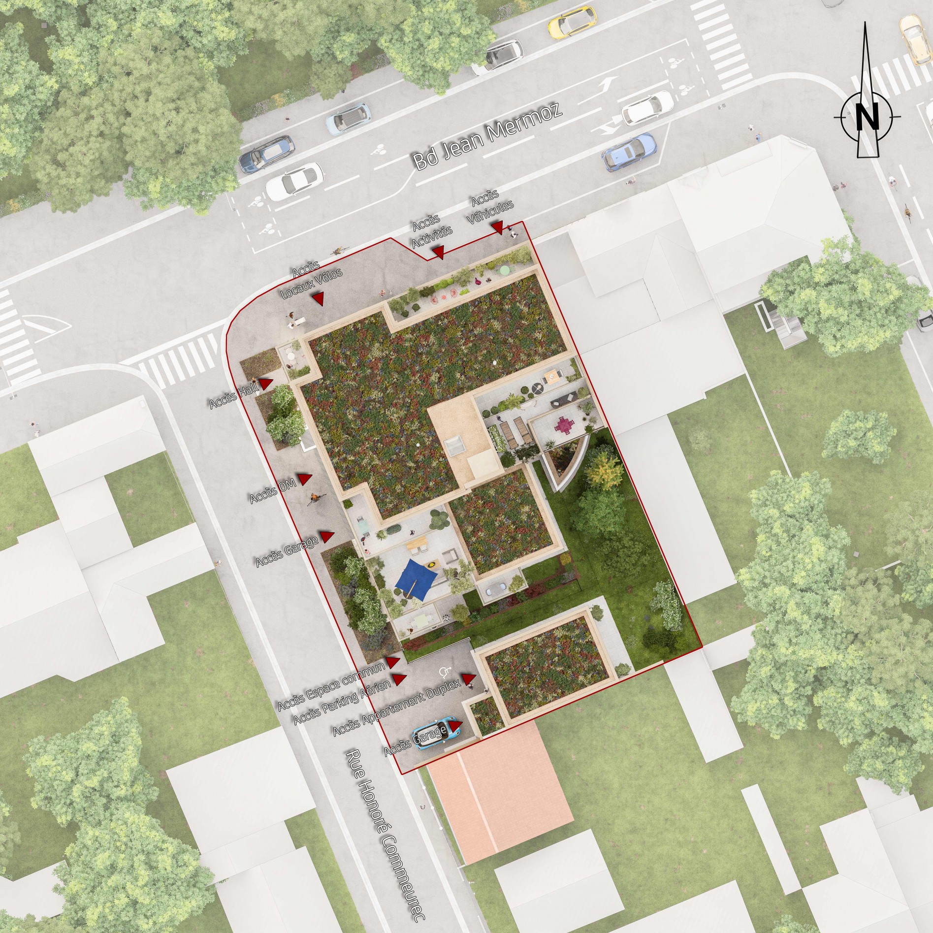 La résidence Honoré s'inscrit au coeur d'un quartier dynamique qui rattache aujourd'hui la commune de Saint Jacques de la Lande à la ville de Rennes. Située à l'angle du bd Mermoz et de la rue Commeurec, elle bénéficie des commerces et services, des transports (lignes de bus C4 et C5) et du métro Courrouze à quelques minutes à pied. Son écriture architecturale associe un langage contemporain avec des matériaux nobles issus d'une conception éco-responsable.