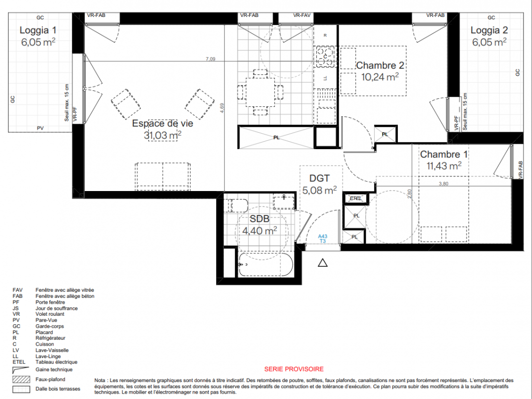 383 100€ Appt. T3 63.47m2 7ème