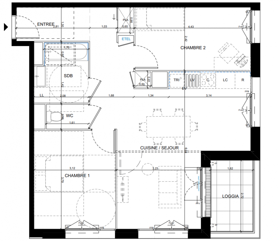 301 308€ Appt. - 60.41m2 3ème