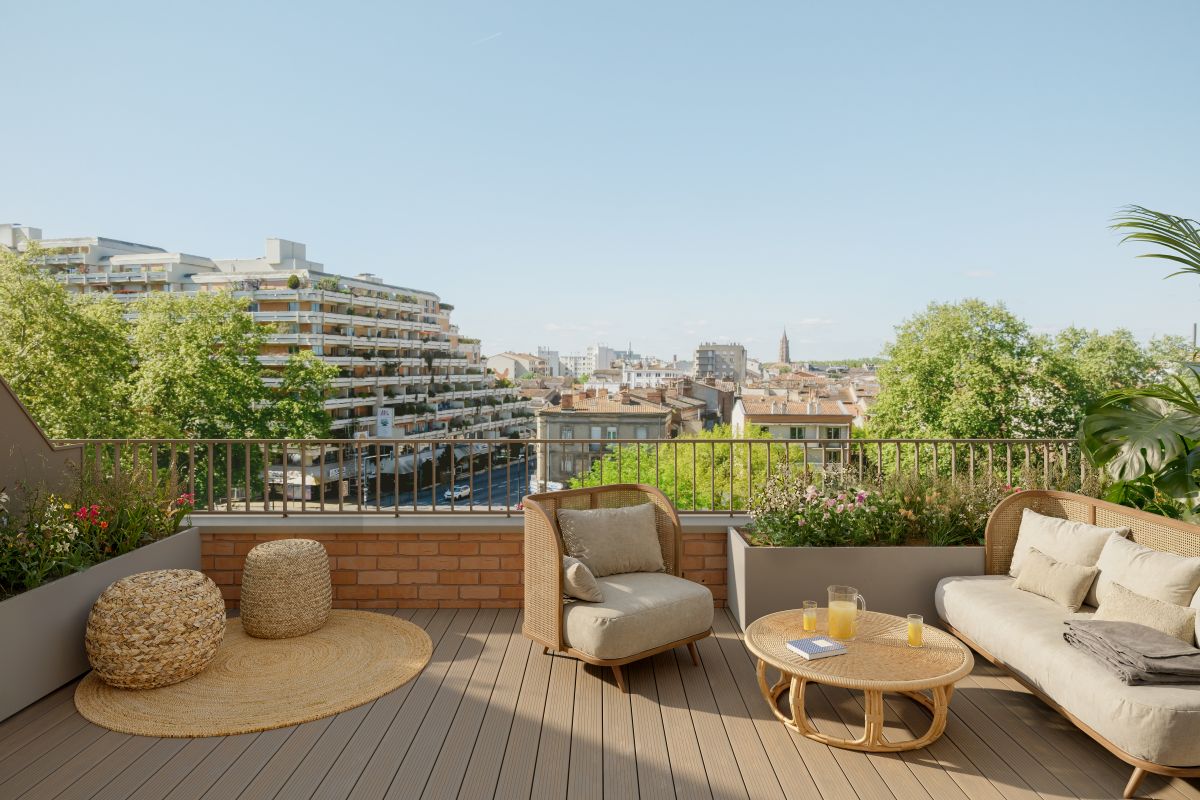 Ce projet mixte associe logements, commerces, une résidence intergénérationnelle et un hôtel, dans une démarche architecturale contemporaine réinterprétant l’identité toulousaine. La biodiversité retrouve sa place en ville grâce à 50 arbres plantés et de nombreuses toitures végétalisées. Conçus avec une attention particulière portée au confort et à la qualité d’usage, les appartements – du studio au 4 pièces, en accession libre ou à prix maîtrisé – offrent, dès le 3 pièces, des configurations traversantes ou bi-orientées, une hauteur sous plafond moyenne de 2,60 m et de généreux extérieurs jusqu’à 45 m². Une terrasse partagée avec jardin potager vient compléter ces espaces privatifs.
